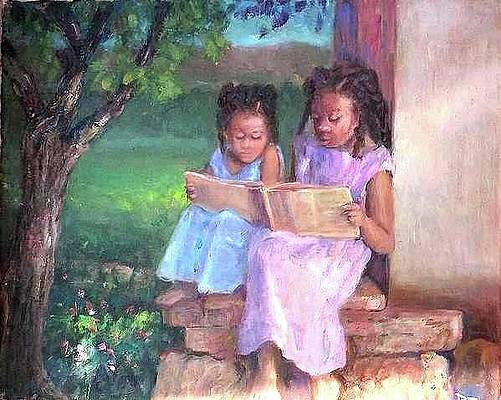Little Students” captures a tender, timeless moment between two young girls immersed in the joy of reading. Seated together on a stone step beneath the shade of a leafy tree, the children share a single book—symbolizing curiosity, imagination, and the bond of learning. Their pastel dresses, soft curls, and gentle expressions create a scene filled with innocence and sisterly connection.
